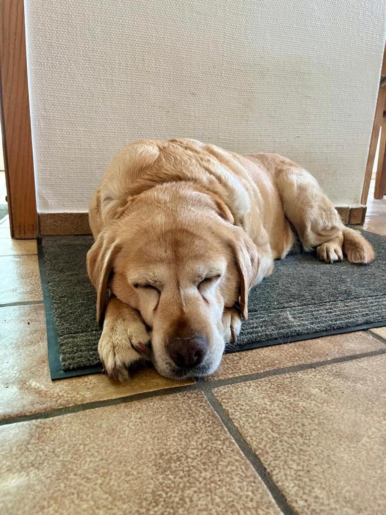 Und hier seht ihr Ronja, technisch gesehen der Hund meiner Großeltern und praktisch gesehen unser Familienhund. Ronjas liebste Dinge auf dieser Welt sind, in genau dieser Reihenfolge: Benutzte Gartenhandschuhe, mein Opa, Gewürzspekulatius. Dreizehn Jahre durfte ich mit Ronja verbringen. An diesem Montag, den 25.08.2025, während ich durch die schottischen Berge gestapft bin, musste sie dann eingeschläfert werden.